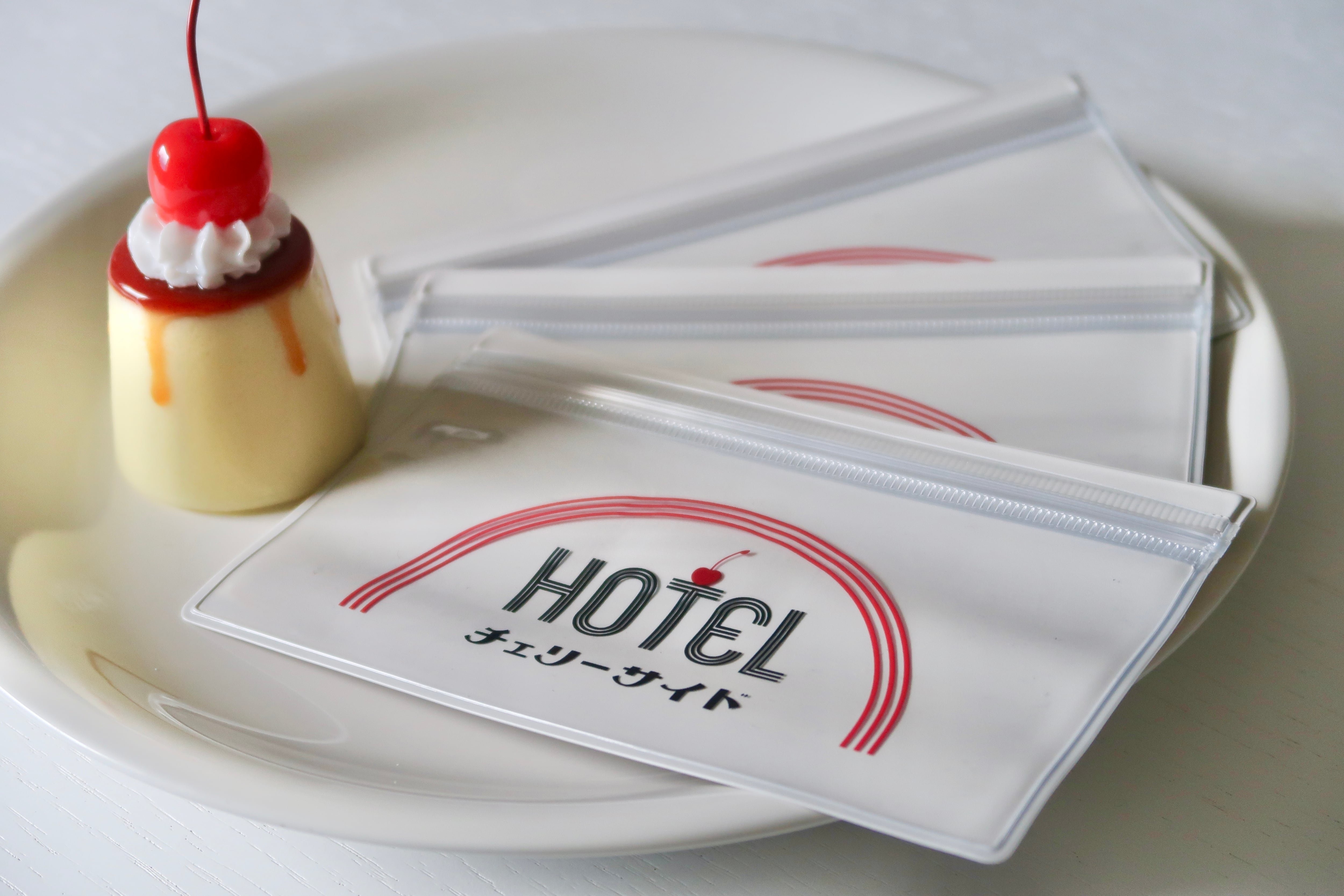 HOTELチェリーサイドのレトロなロゴがプリントされたオリジナルクリアケース。