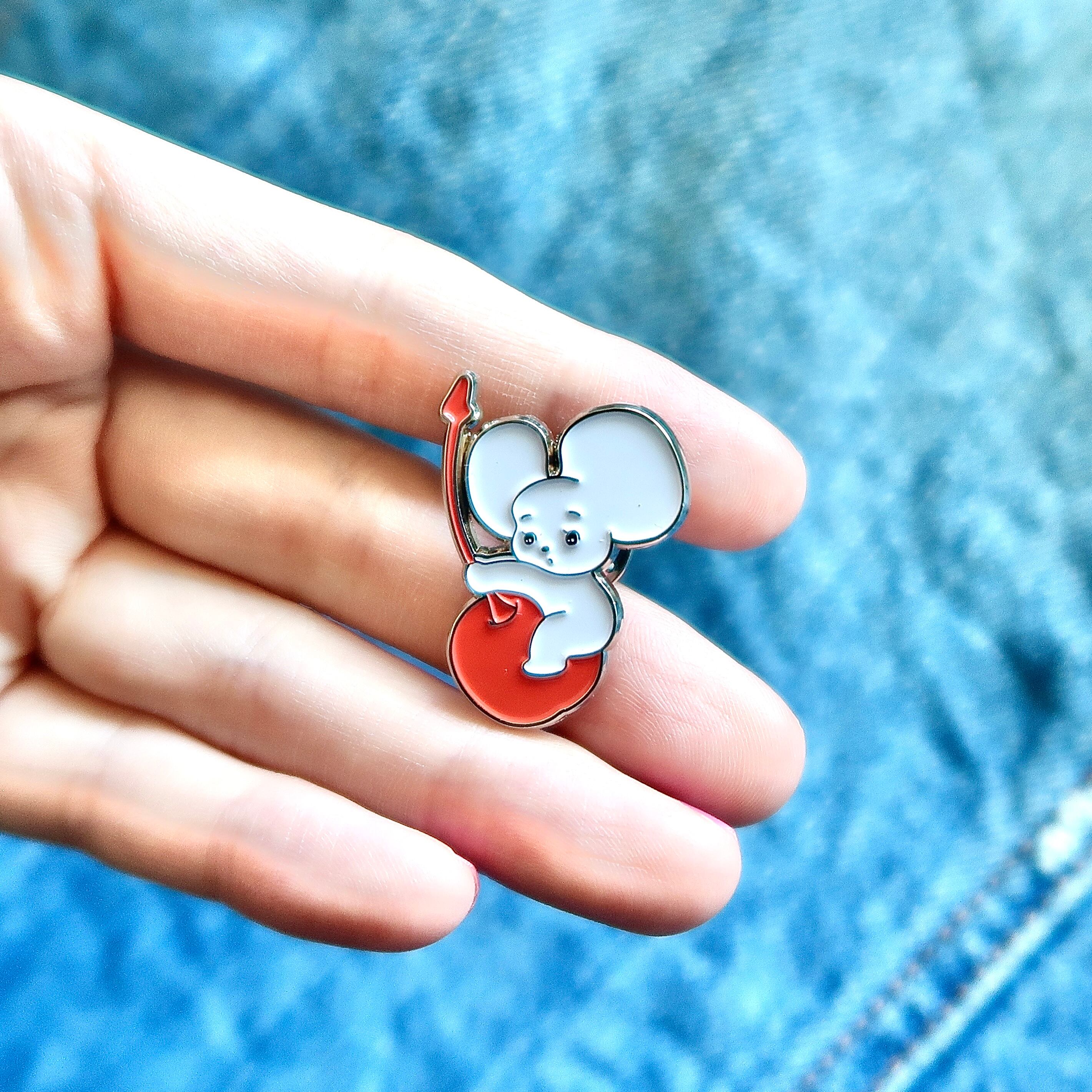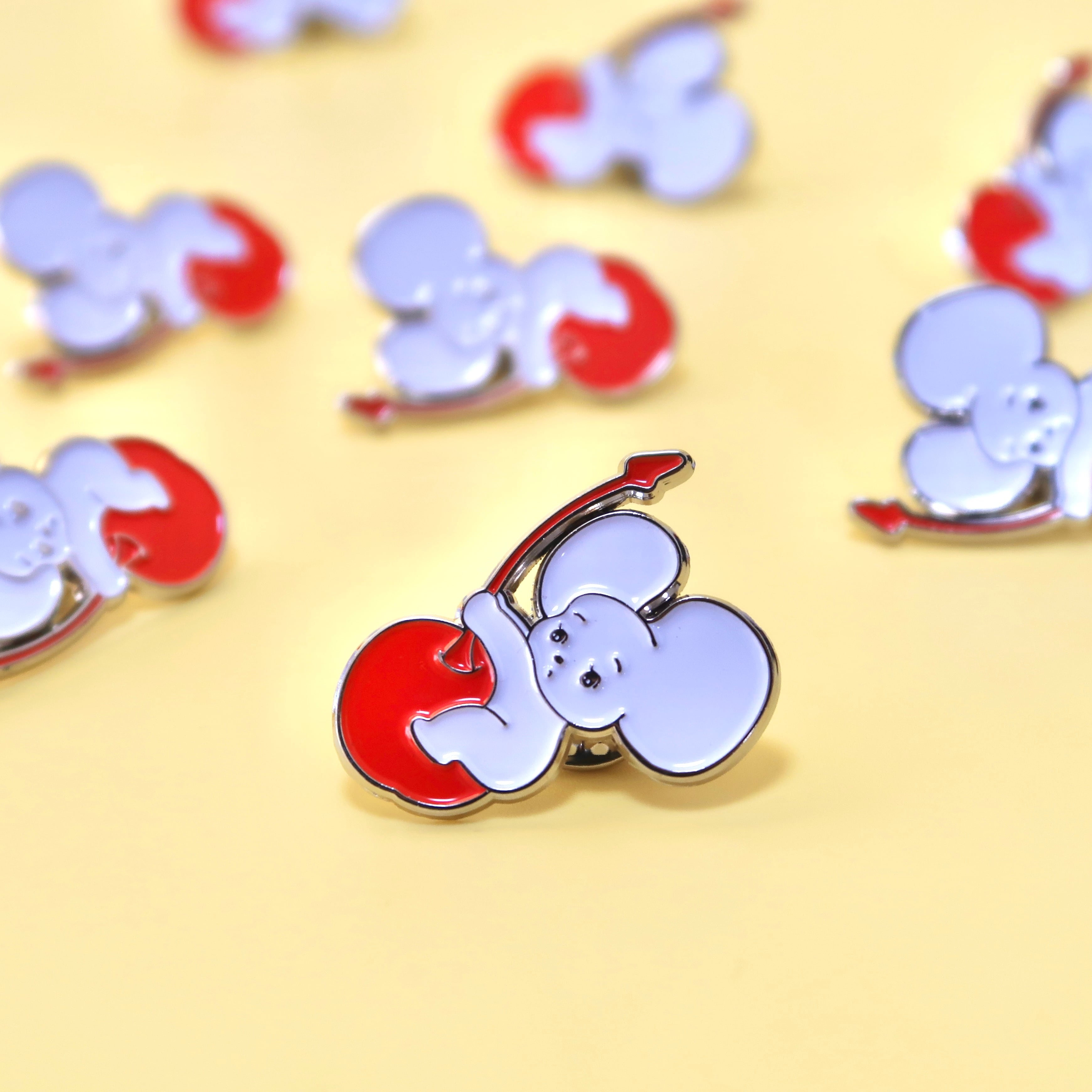さくらんぼにまたがるシラタマちゃんのピンバッジ。